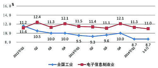 2014年1-5月,規(guī)模以上電子信息制造業(yè)增加值同比增長11.0%,高出工業(yè)平均水平2.3個百分點(diǎn),但比去年同期和去年年底分別下降0.3和1.1個百分點(diǎn)。實現(xiàn)銷售產(chǎn)值、出口交貨值、內(nèi)銷產(chǎn)值同比分別增長9.0%、3.2%和15.7%,比1-4月分別下降0.6、0.7和0.5個百分點(diǎn)。